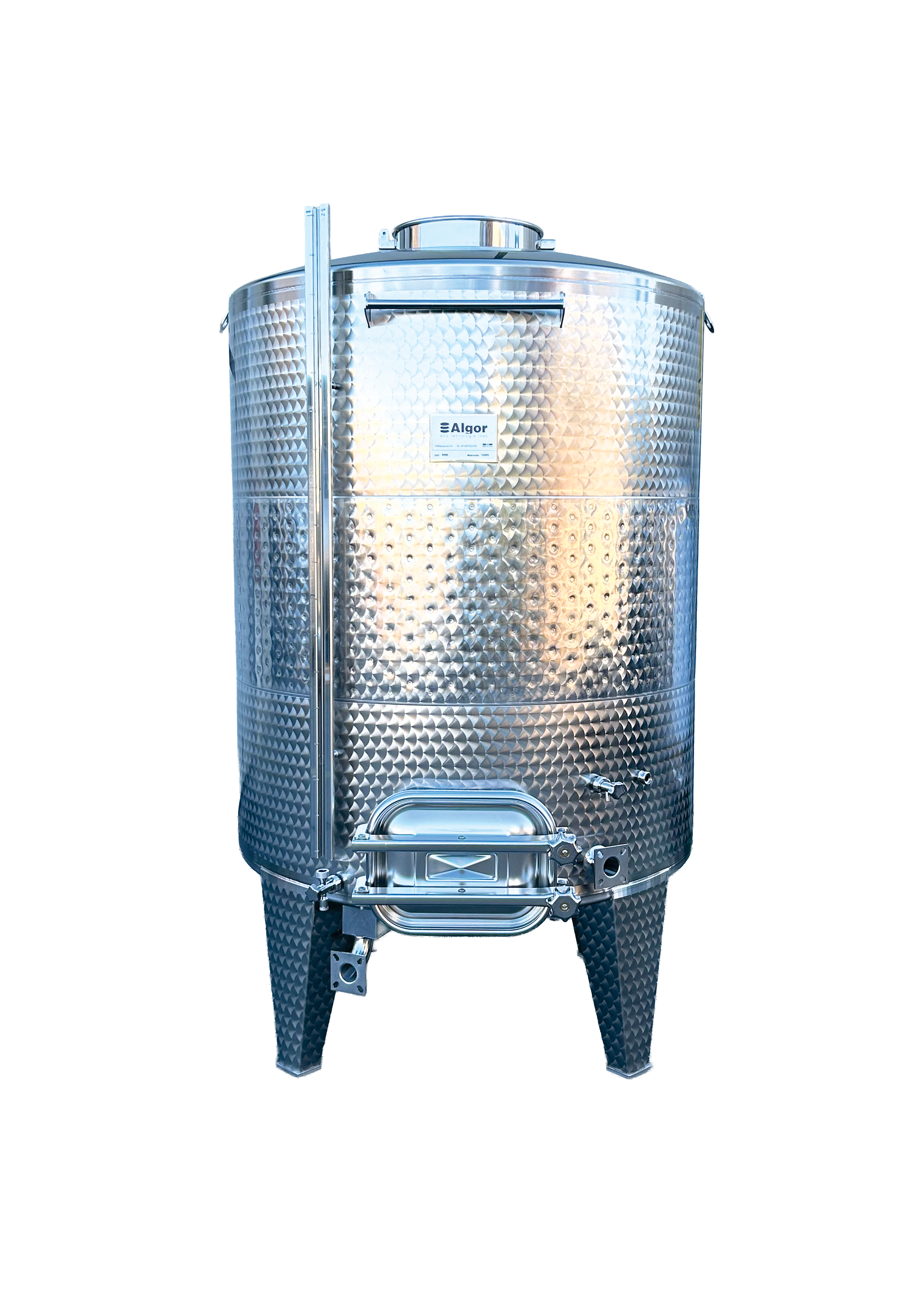 Pneumatic system tank with 5% inclined flat bottom complete with welded feet, wine taster, dipstick, 400mm diameter manhole cover, single cooling pocket and welded door.