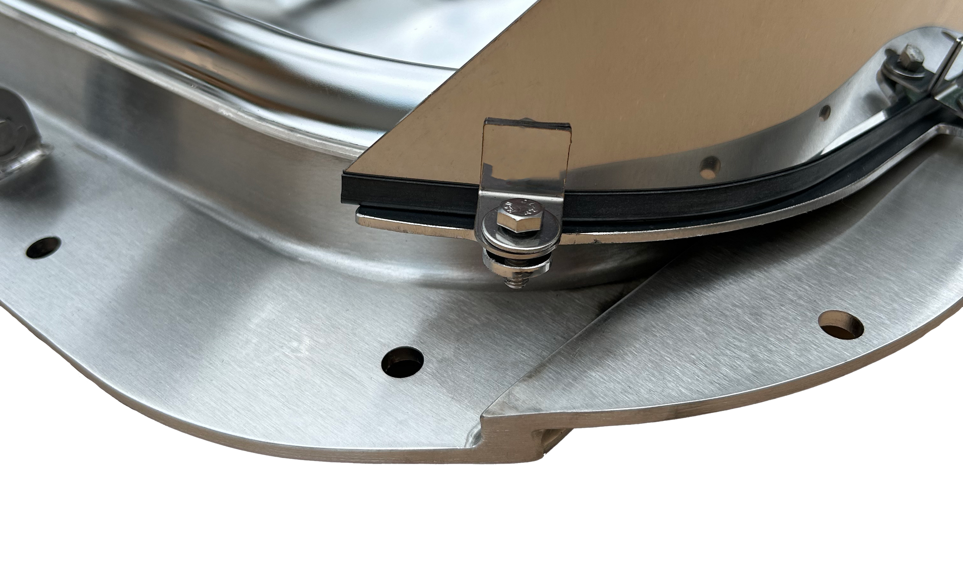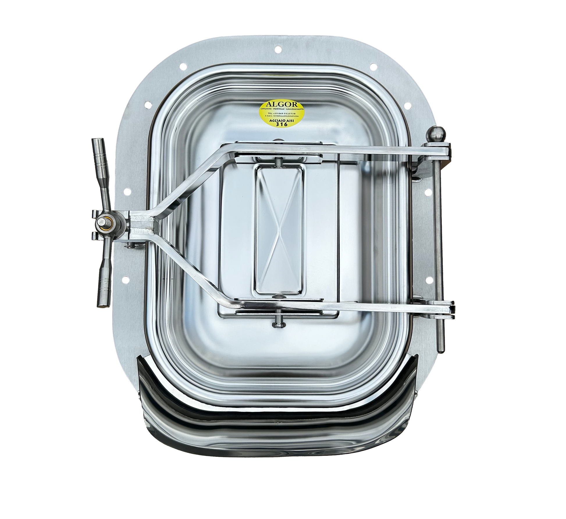 Una delle porte più utilizzate per i tini in legno è di misura standard 420x320mm ad apertura verticale. La porta è disponibile sia nella versione normale che a filofondo. È sempre completa di: guarnizione EPDM (certificata FDA) sul coperchio, volantino in acciaio inox a farfalla e bavarino. Il diametro minimo di raggiatura è 1600mm.